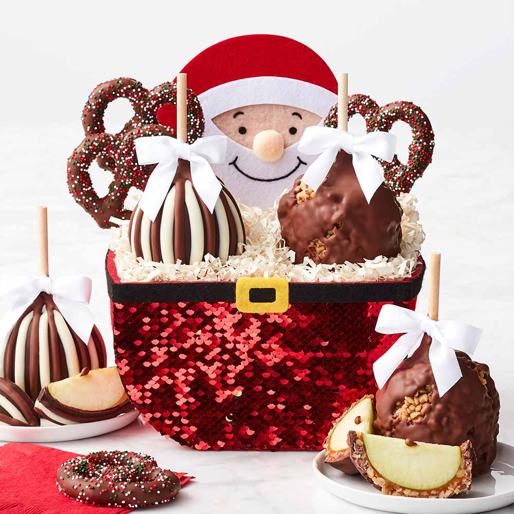 Conceived and illustrated this 3D sequin-adorned Santa Claus basket for gifting caramel apples and treats.